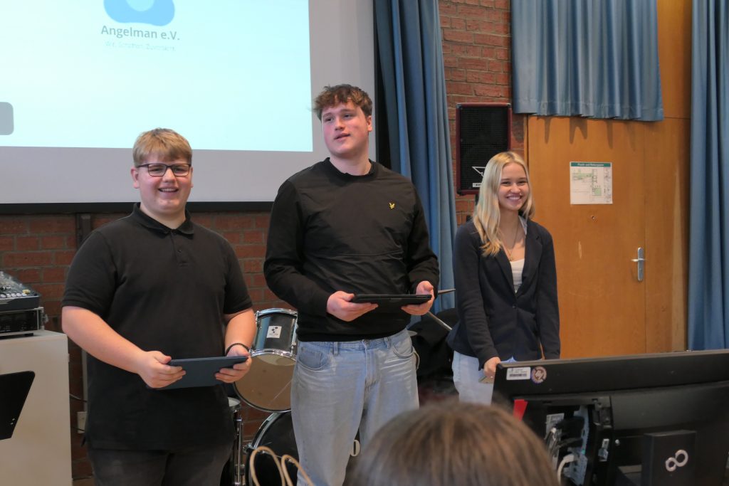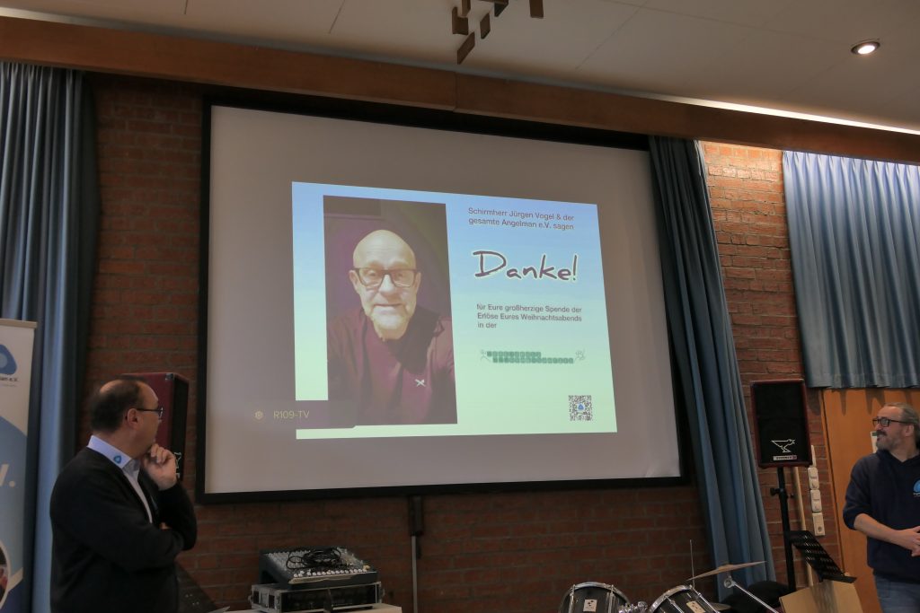 Einen besonderen Dank erhielten die Schülerinnen und Schüler der Realschule vom Schauspieler Jürgen Vogel. Er ist Schirmherr des Angelman-Vereins und richtete seine Dankesworte mit einer Video-Botschaft direkt an sie. Für eine Überraschung sorgte Bürgermeister Thomas Stamm. Er zeigte sich vom Engagement der Schule so beeindruckt, dass er die Spende kurzerhand auf 3500€
