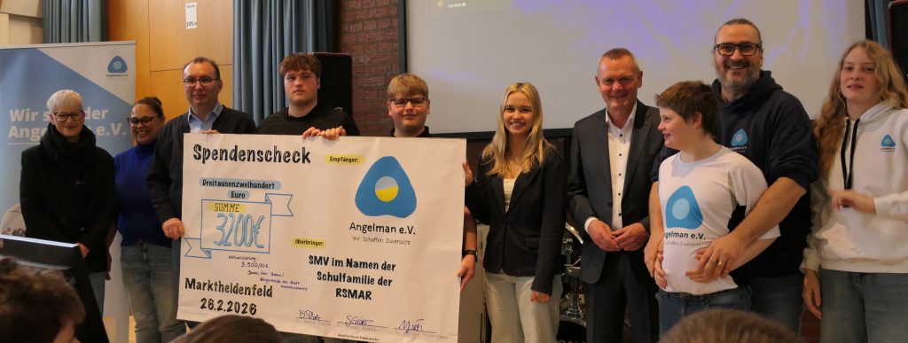 Es ist an der Realschule eine feste Tradition, den Erlös aus dem Weihnachtsabend einem gemeinnützigen Zweck zukommen zu lassen. Da die Schulgemeinschaft im Dezember eine vielseitige und große Weihnachtsfeier organsierte, konnte sie einen besonders hohen Betrag zusammentragen. Ganze 3200€ sollten diesmal an den Angelman-Verein gehen. Der Angelman-Verein ist ein Selbsthilfeverein. Er unterstützt Eltern, deren Kinder mit dem sehr seltenen Gen-Defekt, dem Angelman-Syndrom, geboren wurden.