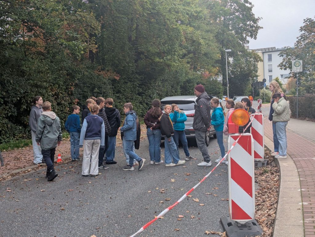 Bei einer ersten praktischen Übung lief ein Kind, das Nachrichten auf seinem Handy las, an seinen Mitschülern vorbei. Dabei konnte es dabei überhaupt nicht wahrnehmen, was um ihm herum geschah. Aufmerksamkeit ist auch nötig, um den Verkehr richtig einzuschätzen. Hier ist es wichtig den ungefähren Bremsweg eines Autos und die Faktoren, die ihn beeinflussen, zu kennen. Um dies den Kindern anschaulich zu demonstrieren, mussten sie erst ihren eigenen Bremsweg herausfinden. Alle wurden zuerst aufgefordert, einige Meter zu sprinten und dann nach einem Flaggenzeichen abrupt anzuhalten. Selbstverständlich konnte niemand sofort stoppen, sondern alle liefen noch einige Meter weiter.