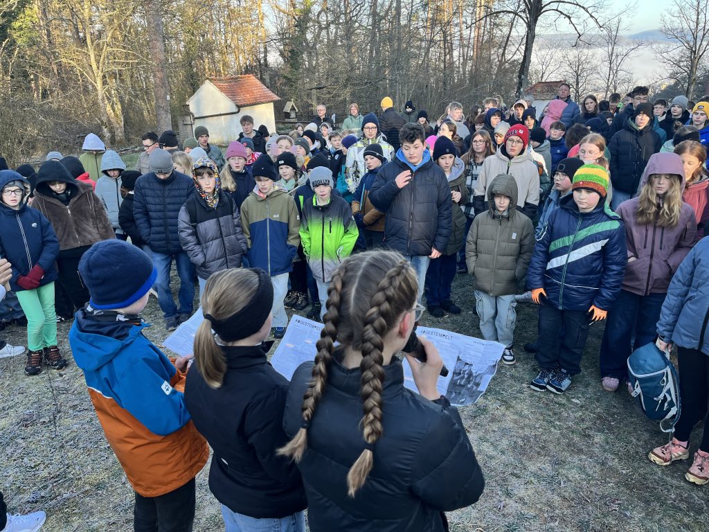 „Rette dich selbst, wenn du der König der Juden bist“ verspotteten die Soldaten Jesus am Kreuz. In den Spott stimmten sehr schnell zahlreiche weitere Teilnehmer ein. Eindrucksvoll schlugen hier die Impulsfragen den Bogen zur Lebenswelt der Schüler: Wo machst du dich über andere lustig? Warum hast du mitgemacht? Was hat dich dazu gebracht, mitzumachen, zu schweigen oder wegzuschauen? Der Hauptmann unter dem Kreuz zeigt beispielhaft, wie sich im Leben plötzlich etwas verändern kann: ein Wort, ein Bild, ein Nachdenken. „Dieser Mensch war Gottes Sohn“ stellt der fest, der kein Freund oder Jünger war, sondern einfach Befehlsempfänger. Unerwartet kann Gott auch im Leben von Schülern wirken, eine neue Perspektive ermöglichen, ins Staunen versetzen. Vor der Kreuzbergkapelle stellten sich die Teilnehmer zum traditionellen Gruppenfoto auf. Die Kreuzigungsgruppe neben der Kapelle bildet in bewährter Weise auch eine Station auf dem Weg. Dass zwei der Sandsteinfiguren durch Vandalismus zerstört wurden, regte zum mahnenden Nachdenken an.