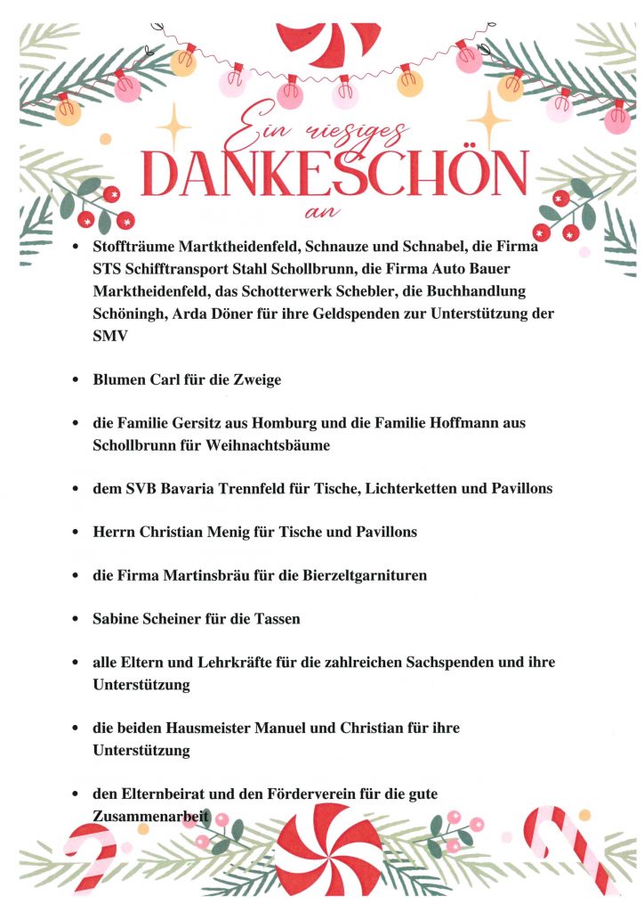 liebevollen Dekoration und einer großen Vielfalt an Angeboten, allen Gästen die Stimmung eines richtigen Weihnachtsmarktes zu vermitteln. Wer wollte, konnte noch letzte Weihnachtsgeschenke erwerben. Im Angebot gab es selbstgemachte Plätzchen, Weihnachtsschmuck, weihnachtliche Karten sowie verschiedenste Bastelarbeiten. Beim Elternbeirat konnte man sich mit Getränken und Waffeln und beim Förderverein mit Bratwürsten, auch mit der vegetarischen Variante, stärken.